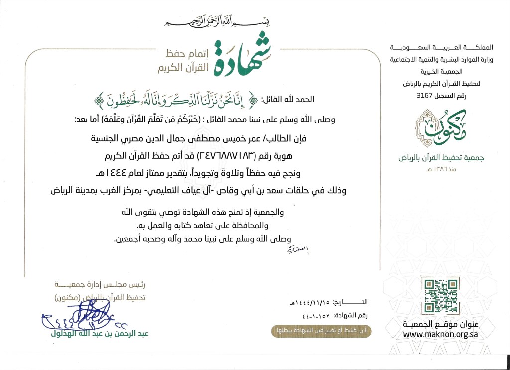 شهادة إتمام حفظ القرآن الكريم من جمعية تحفيظ القرآن بالرياض August 4, 2023 by omargamaleldeen الجمعية الخيرية لتحفيظ القرآن الكريم بالرياض – مكنون