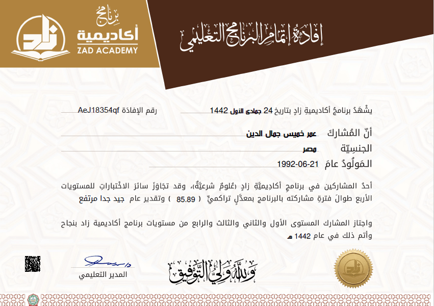 الحمد لله الذي هدانا لهذا وما كنا لنهتدي لولا أن هدانا الله ، والصلاة والسلام على معلم الإنسانية سيدنا محمد وعلى آله وصحبه أجمعين – وبعد: فقد قرأ عليَّ الأخ الفاضل / عمر خميس مصطفى جمال الدين ، المولود في 21/6/1992 م محافظة الغربية – مصر ، القرآن الكريم من أوله الى آخره براوية حفص عن عاصم من طريق الحمامي عن الولي عن الفيل عن عمرو بن الصَّبَّاح بمضمون كتاب المصباح بقصر المد المنفصل