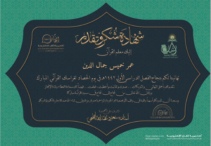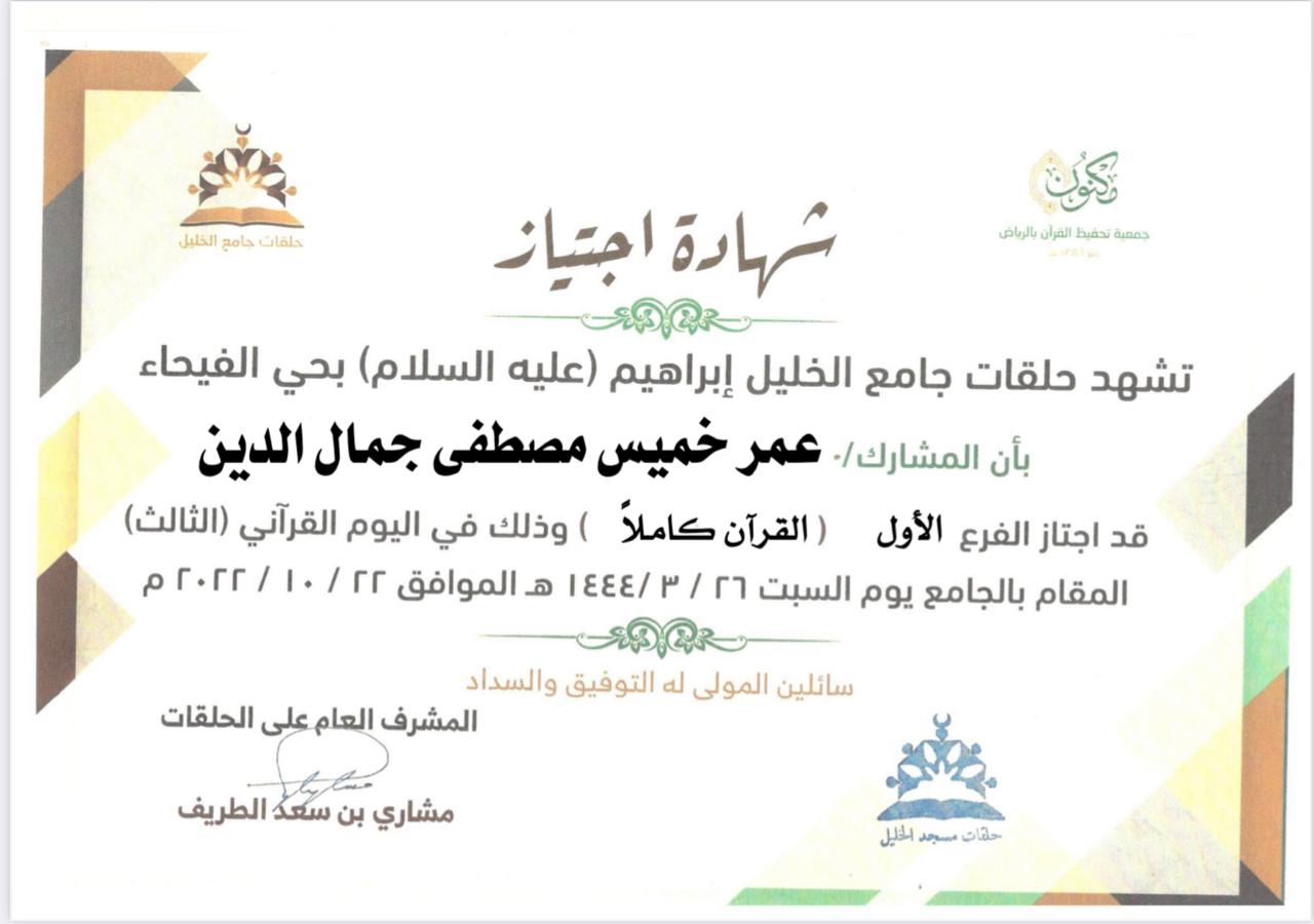 الحمد لله الذي هدانا لهذا وما كنا لنهتدي لولا أن هدانا الله ، والصلاة والسلام على معلم الإنسانية سيدنا محمد وعلى آله وصحبه أجمعين – وبعد: فقد قرأ عليَّ الأخ الفاضل / عمر خميس مصطفى جمال الدين ، المولود في 21/6/1992 م محافظة الغربية – مصر ، القرآن الكريم من أوله الى آخره براوية حفص عن عاصم من طريق الحمامي عن الولي عن الفيل عن عمرو بن الصَّبَّاح بمضمون كتاب المصباح بقصر المد المنفصل
